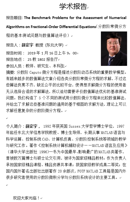 薛定宇教授学术报告-1月16日
