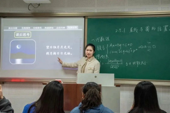 参加高中数学组比赛的张瀚月则以《直线与圆的位置关系》为主题,以中华传统文化与数学知识的结合作为课堂亮点。在课程引入和结尾都巧妙引用诗句,让学生从现实生活中感受数学,运用类比,探究出两种判断直线与圆的位置关系的方法,充分体现数形结合的思想。