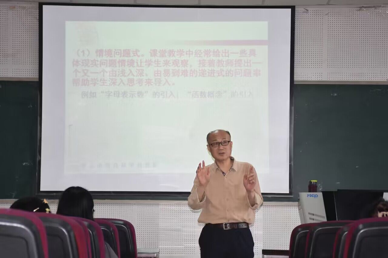张晓斌老师的报告围绕教学艺术,探讨了教学过程中引入、设问、例习题讲解、小结这四个环节的艺术。张晓斌老师通过详细地剖析教学案例,帮助同学们理解如何巧妙地设计课堂。在讲解“出其不意式”课堂引入方法时,张晓斌老师以“完全平方公式”的引入为例,介绍“一般法则特殊化”和“直观图形代数化”两种方法,使学生在惊奇中迫切进入积极思维状态,达到“出其不意”的效果,充分展现了引入课堂艺术的魅力。