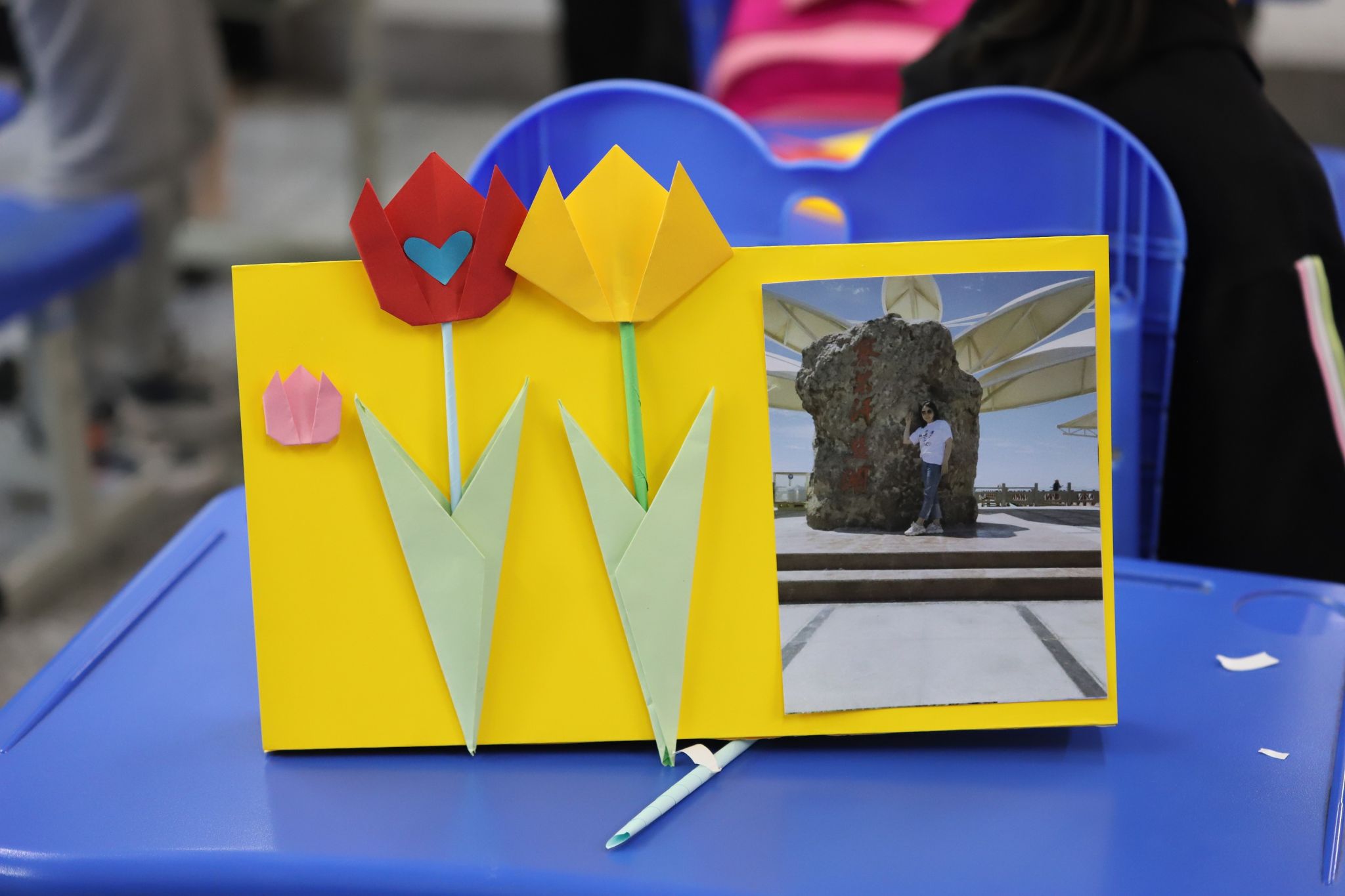 除了对妈妈的爱,孩子们还显露出了超出志愿者预期的温暖心意。有的孩子跟志愿者要了多余的卡纸,说要再折一朵花送给自己的外婆;还有的孩子,在花上歪歪扭扭地写上“贺老师太辛苦了”,将花送给了自己的班主任。