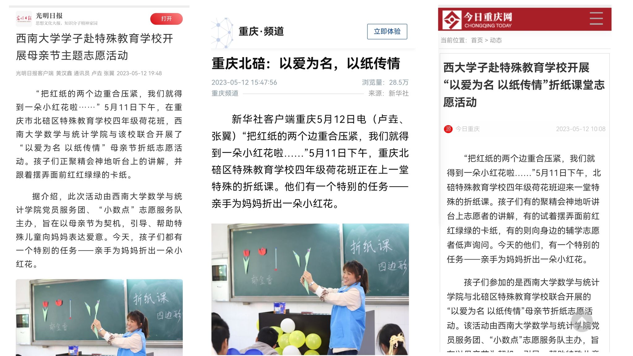5月11日下午,学院党员服务团、“小数点”志愿服务队来到北碚区特殊教育学校,开展了“以爱为名 以纸传情”母亲节主题折纸志愿活动。本次活动取得了较好效果,获光明日报、新华社、重庆日报及今日重庆等多家媒体报道。以下为报道原文:
