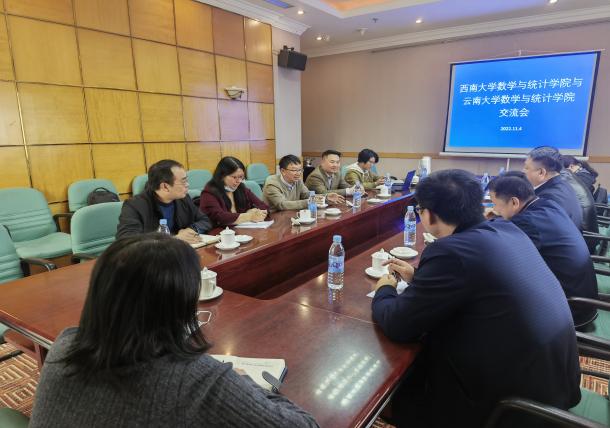 为进一步提高学院办学质量,学院利用参加第十五届部属师范大学数学、统计学学科建设研讨会契机,于11月4日赴云南大学pa视讯官方集团调研。参加会议的有云南大学pa视讯官方集团院长唐年胜、副院长潘东东、统计系主任李会琼、外事专员周建军、统计系本科教学秘书陈黎、pa视讯官方集团常务副院长刘贤宁、副院长王建军、商彦英、邓圣兵、统计学系主任李婷婷、教学办主任唐海、行政秘书姜文群。会议由唐年胜院长主持。