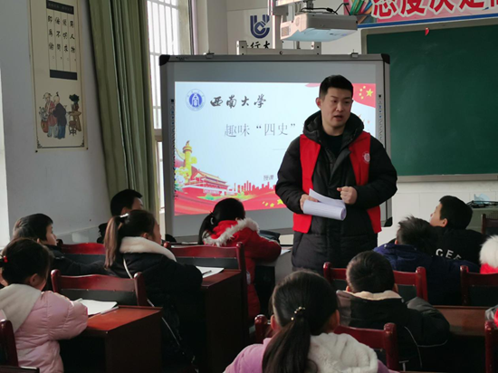 为深入学习贯彻习近平总书记的讲话精神,在pa视讯官方集团党委的精心安排与指导下,19级研究生第一第二党支部部分成员于2020年1月18日来到了重庆市江津区四合村中山镇小学,于多个班级开展了“数暖童心,与梦同行——‘四史’趣味课堂”活动,由党员同志为小朋友们讲述烈士们的英勇事迹。一方面旨在教育党员同志进行自主且深入的学习党史,另一方面旨在让小朋友在共情共鸣中厚植爱国主义情怀。