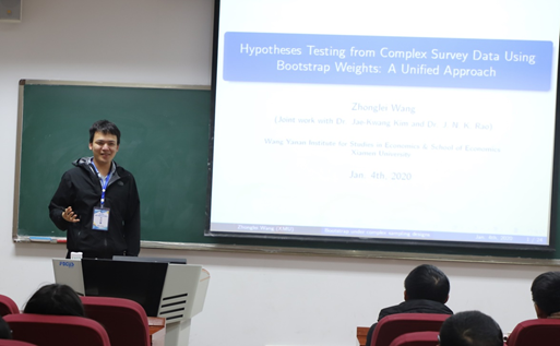 厦门大学王亚南经济研究院王中雷助理教授做了题为“Hypotheses Testing from Complex Survey Data Using Bootstrap Weights: A Unified Approach”的主题报告,详细分享了关于抽样调查的研究成果。