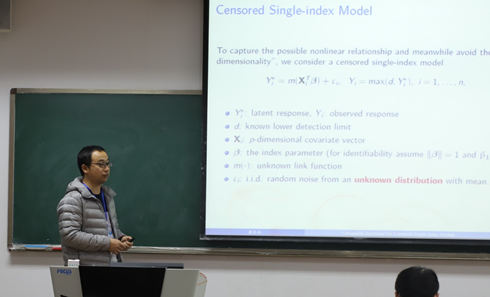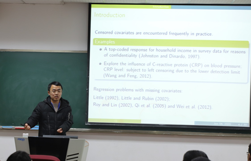 4日下午,西南交通大学数学学院统计系黄磊副教授做了“Nonparametric Regression with a Randomly Censored Independent Variable”的主题报告,介绍分享了相关的研究结果。