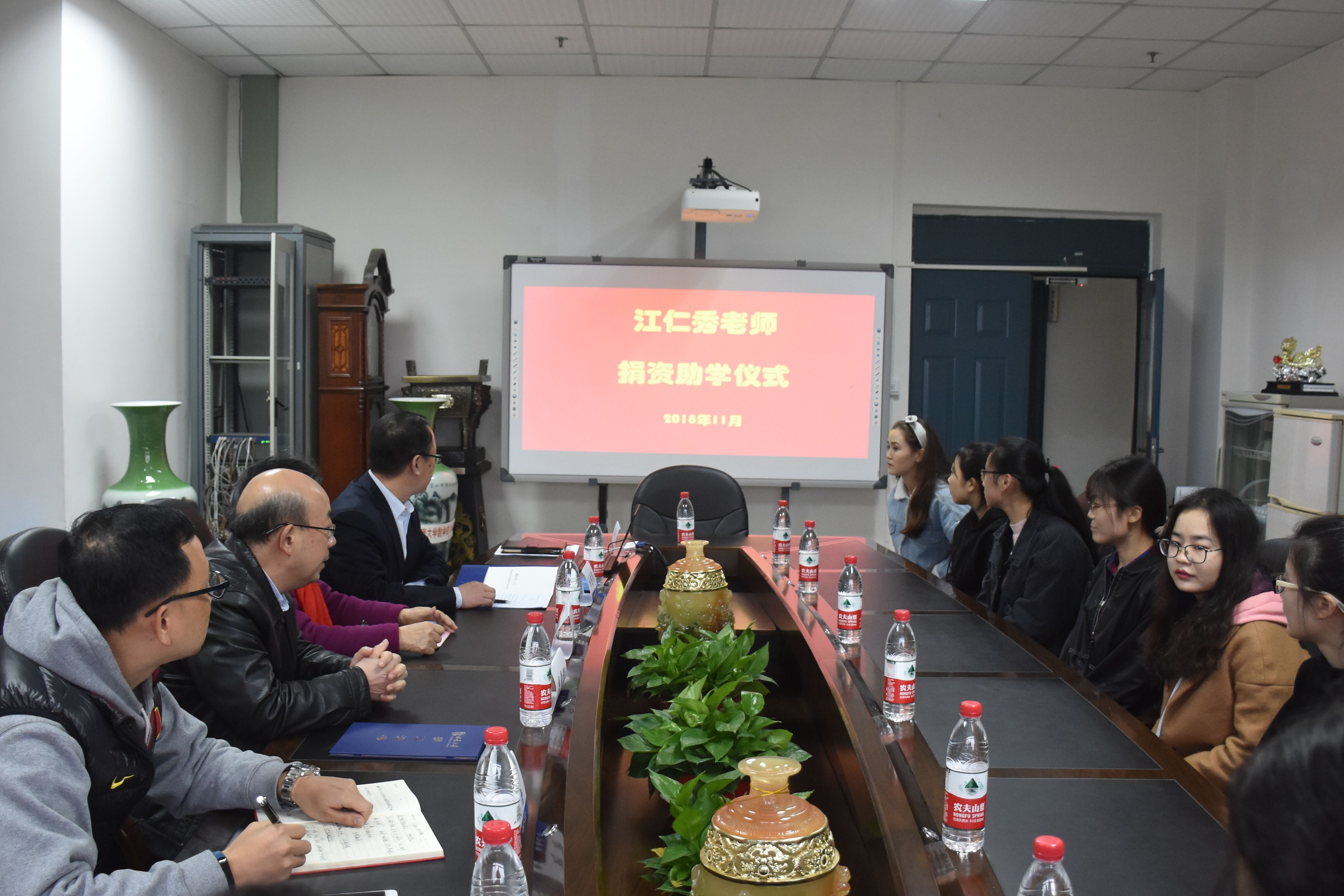2018年11月12日下午,江仁秀老师捐资助学仪式在pa视讯官方集团会议室举行。pa视讯官方集团退休教师江仁秀副教授、对外联络部部长龚常智、对外联络部副部长刘涛、pa视讯官方集团党委书记易遵尧、副院长王建军,以及受资助的10名学生参加了捐赠仪式。捐赠仪式由pa视讯官方集团学院党委副书记罗利江主持。