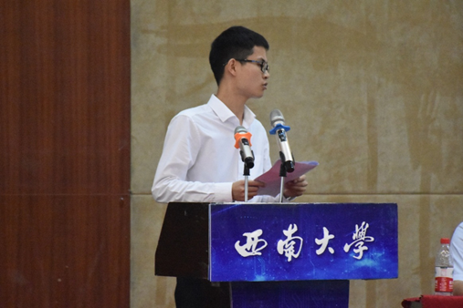 2018届研究生毕业生代表余霖在发言中表示,在西南大学,自己度过了难以忘怀的时光。他感谢学院、老师的照顾与教导,感谢同学的支持与帮助。他表示,毕业并不代表结束,而是人生的起点,希望每个毕业生能在接下来的人生中努力工作,拥有光明远大的未来。