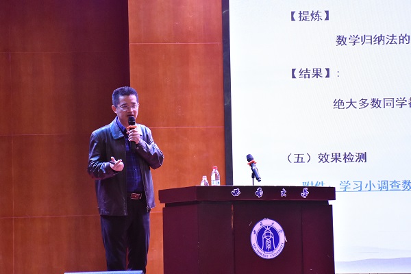 党忠良以“基于促进学生理解数学本质的高中数学课堂教学设计研究”为题,从“数学归纳法”的课堂观察出发,提出了高中数学教学应促进学生理解数学的本质,并根据所带领课题组的实践研究成果,介绍了基于促进学生理解数学本质的高中数学课堂教学设计策略与途径。党院长指出,教学具有整体性,蕴含着以“事实——方法——方法论——数学学科本质观”为主要内容的暗线,发挥暗线作用的育人价值,使得数学归纳法的抽象思想变得具体化,能让学生切实感受到、体验到,从而增强其“可意会性”,这是一件更加诱人更具挑战性的工作。党院长还展示了七条有助于学生理解高中数学概念本质的策略,帮助师范生有效理解高中数学教学中的基本概念。