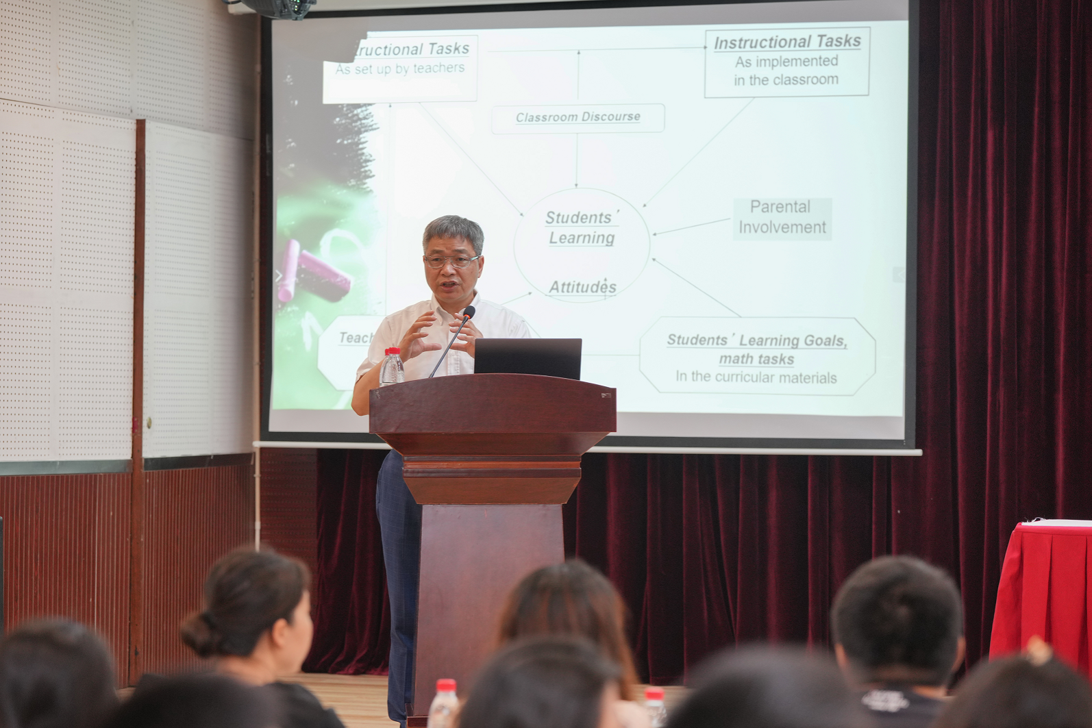 5月30日下午,蔡金法教授在师元讲堂为我院师生做了题为“Where Is Mathematics in Mathematics Education Research?”专题学术讲座,讲座由学院常务副院长刘贤宁教授主持。讲座中,蔡金法教授通过十项中外实证比较研究,阐释了数学在数学教育研究中的重要性,讲解了关于如何提高学生数学学习的经验和策略,讲座深入浅出、案例丰富。在交流环节,蔡金法教授耐心细致地对师生提出的疑问进行了解答,并鼓励同学们积极思考,发出年轻的声音,共同完善对数学教育的研究。
