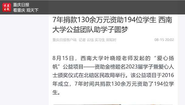 8月15日,一场特别的活动在北碚区民政局举行。这是由学院教师叶晓娅发起的“爱心扬帆”公益助学活动。在此次活动上,由叶晓娅牵头的公益团队和北碚区慈善会为48名已被大学录取的2023届学子发放了荣誉证书和1000元奖金,为他们提前送上了一份充满爱心的开学礼物。此次公益助学活动获得了重庆日报、华龙网、重庆电视台等媒体的关注和报道,取得了良好的社会反响。