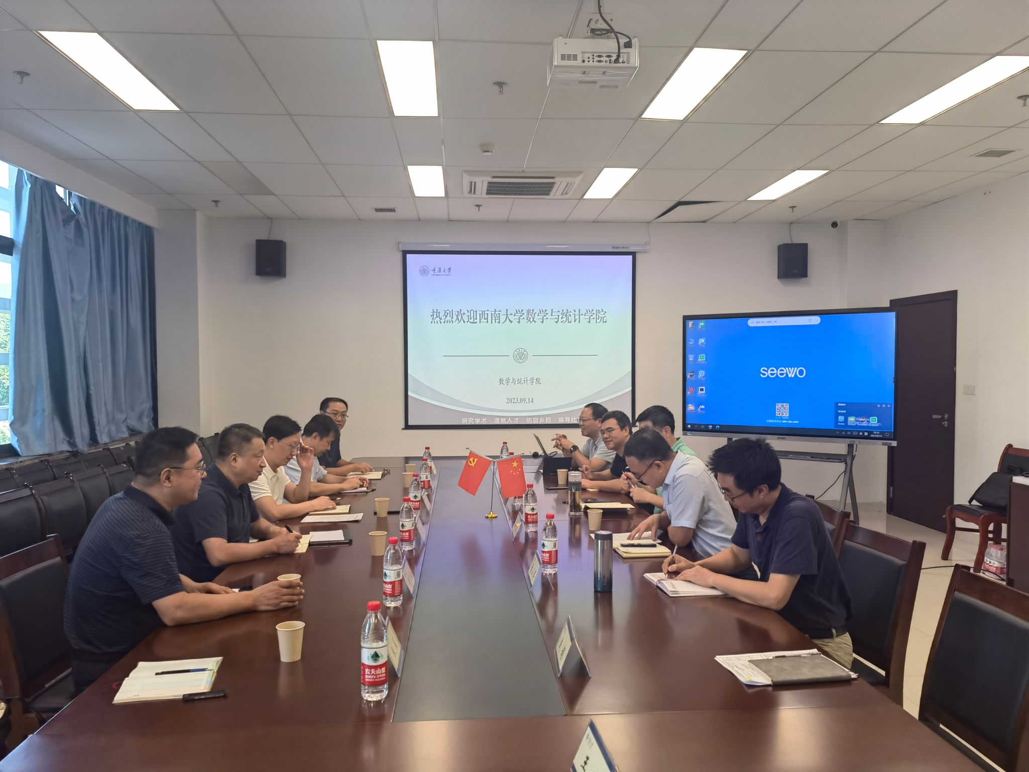 14日上午,在重庆国家应用数学中心,学院班子成员与中心主任杨新民教授、重庆师范大学数学科学学院党委书记杨江水等进行了座谈交流。重庆国家应用数学中心常务副主任刘学文、杨江水书记分别对中心建设经验、数学科学学院发展情况进行了介绍,双方就中心建设经验、人才引进策略、科研激励手段等开展了深入交流,进一步与中心合作建设等事宜达成了共识。