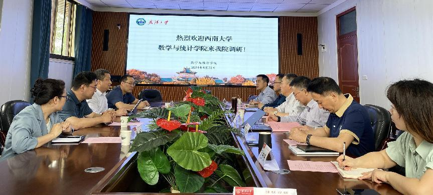 23日上午,学院班子成员接着到华中师范大学数学与统计学学院调研。华中师范大学数学与统计学学院党委副书记周彦主持调研座谈会,院长周远扬致欢迎辞并介绍华中师范大学数学与统计学学院相关情况,详细介绍了学院近几年来“双一流”建设、中心平台建设、课程建设、人才队伍建设等取得的发展成果。副院长郑高峰介绍了教学信息化建设、师范生培养特色、统计学“1+N”课堂教学模式等情况,副院长左国新介绍了本科生招生和研究生培养情况,副院长郭玉劲分享了人才培育与国际学术交流的做法和经验。
