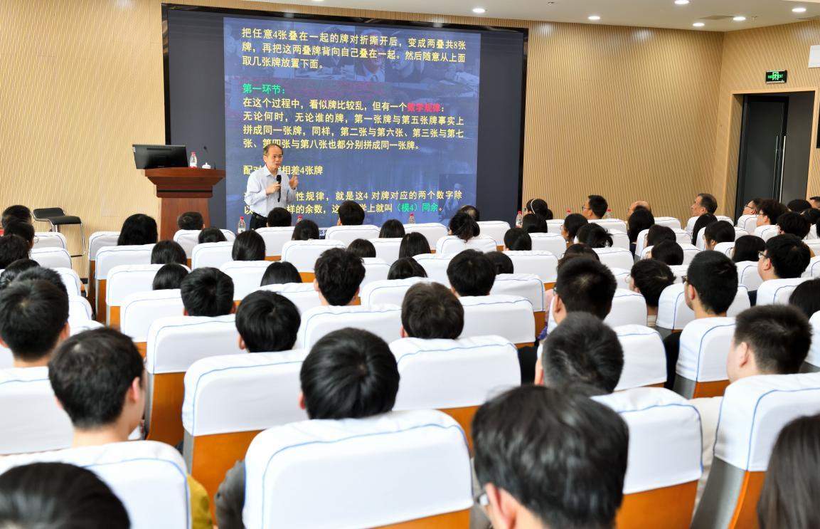 报告伊始,周向宇院士从春晚魔术讲起,“魔术师通过一系列复杂的操作和设计,成功将抽象的数学问题转化为生动有趣的魔术表演”,带领师生们共同揭秘魔术背后所蕴含的数学原理设计——同余理论,引出“物不知数”问题及孙子 “神机妙算”之解、中国剩余定理等数学思想,中国古代数学“言约旨远”,由浅入深,激发在场师生探索数学奥秘。紧接着,周向宇院士基于发表于《数学学报》的学术论文,详细解说了《周髀算经》中勾股定理、《孙子兵法》中神机妙算、《九章算术注序》中重差公式,介绍了中国古代关于数论、代数运算、无穷与极限的思想,也为在场师生复原了中国古代数学中勾股定理的商高证明,揭示其蕴含的商高“折矩”原理、“积矩”思想、商高-赵爽“形体不变量”思想。随后,周向宇院士通过结合古代实例,由高次方程的数值解的问题引出了唐朝的王孝通的伟大思想成果,这是数学智慧与古代现实生活碰撞的火花,也是我国古代数学家的伟大成就,引领师生深刻体会中国古代数学的魅力。