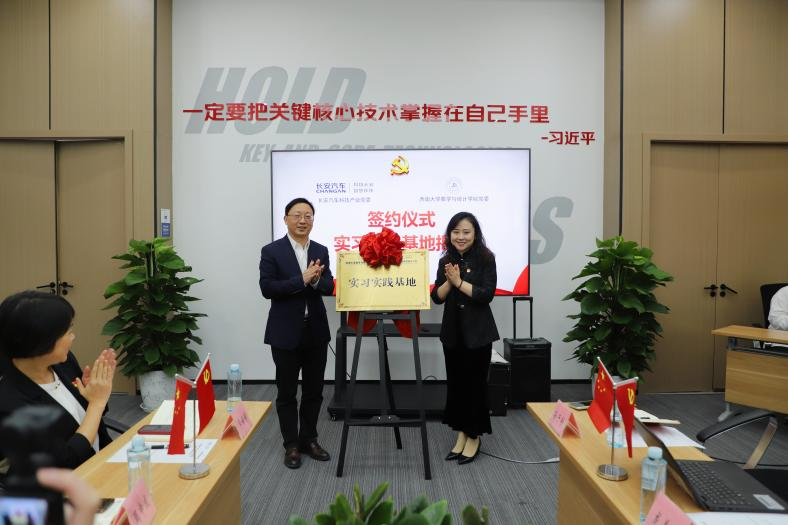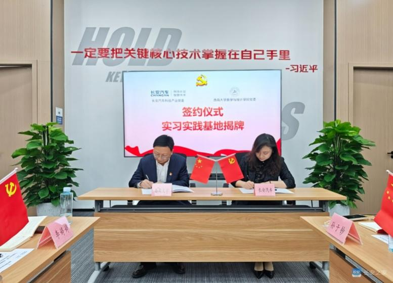 最后在双方人员见证下,学院党委书记唐宇、长安汽车科技产业党委副书记李玮洁代表双方党组织庄重签署了《党建联建合作协议》,共同为“实习实践基地”揭牌。这标志着双方共建关系进入了制度化、常态化的新阶段,双方明确将通过联合开展“三会一课”等方式强化基层党组织的共建联系,在人才培养、科学研究等方面进行深入探索和深度合作。学院党委依托数学基础学科优势为长安汽车“北斗天枢”战略落地提供科研支持,长安汽车科技产业党委则以实习实践基地、“校企双导师”等形式为学院人才培养提供前沿视域和实践场景,助力学子专业素养与职业技能进一步提升。